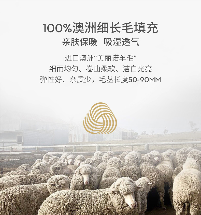 澳洲进口羊毛内胆,此类羊毛细而均匀,卷曲柔软,洁白光亮,弹性好,杂质少,毛丛长度50~90MM。