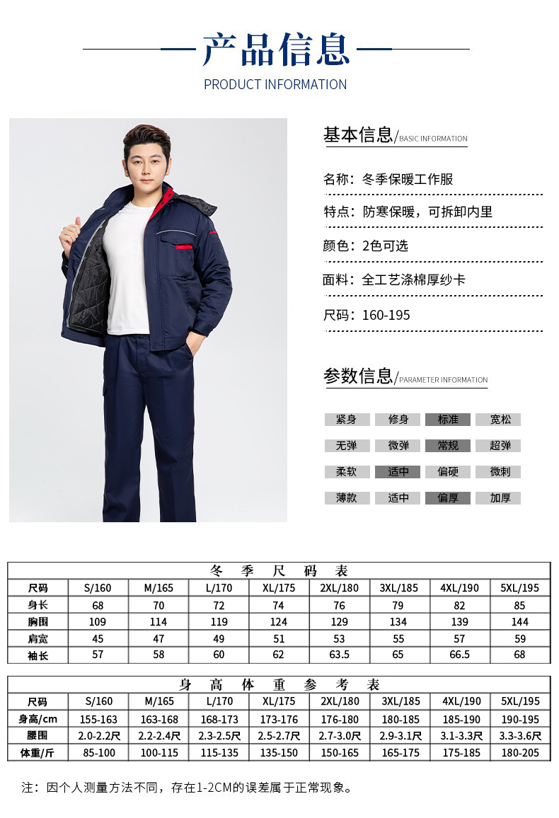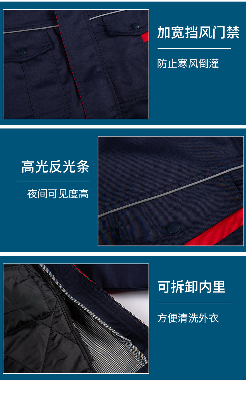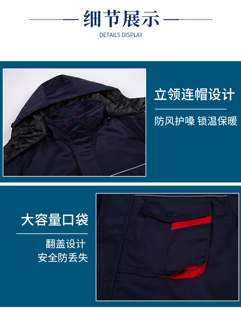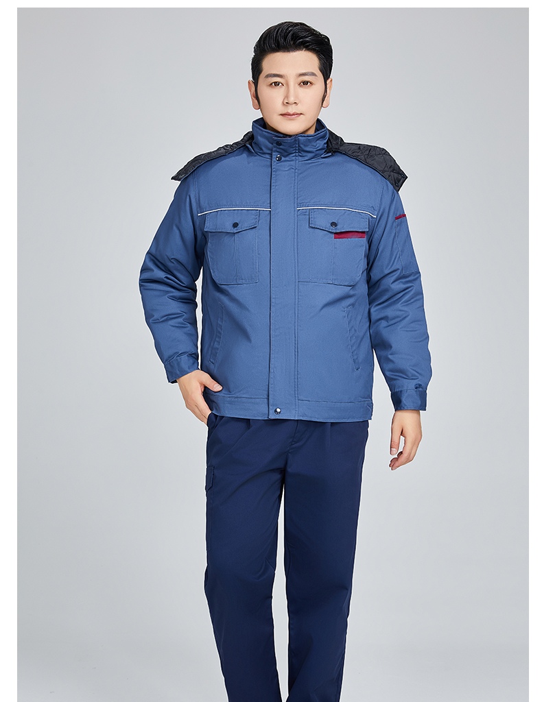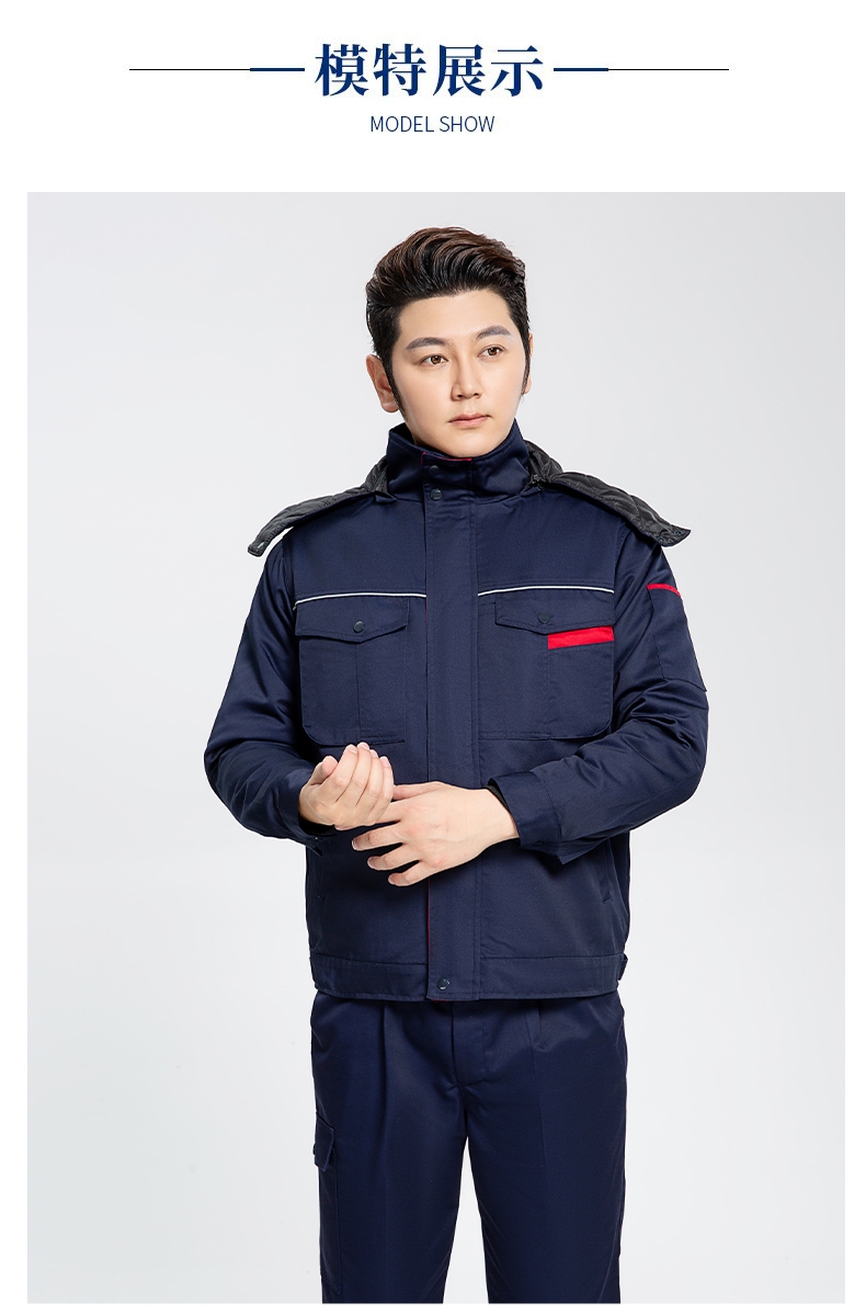 石家庄工装定制定做的这款冬季防寒保暖的工作服,两色可选,可拆卸内里,全工艺涤棉厚纱卡面料。