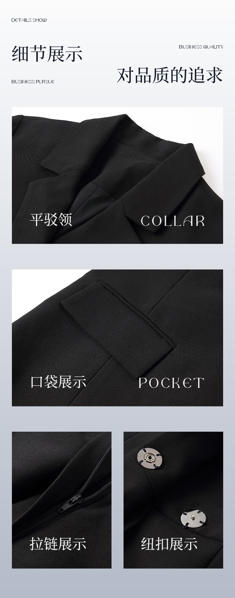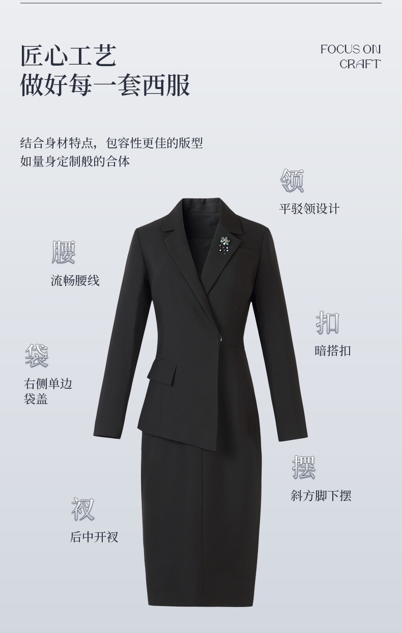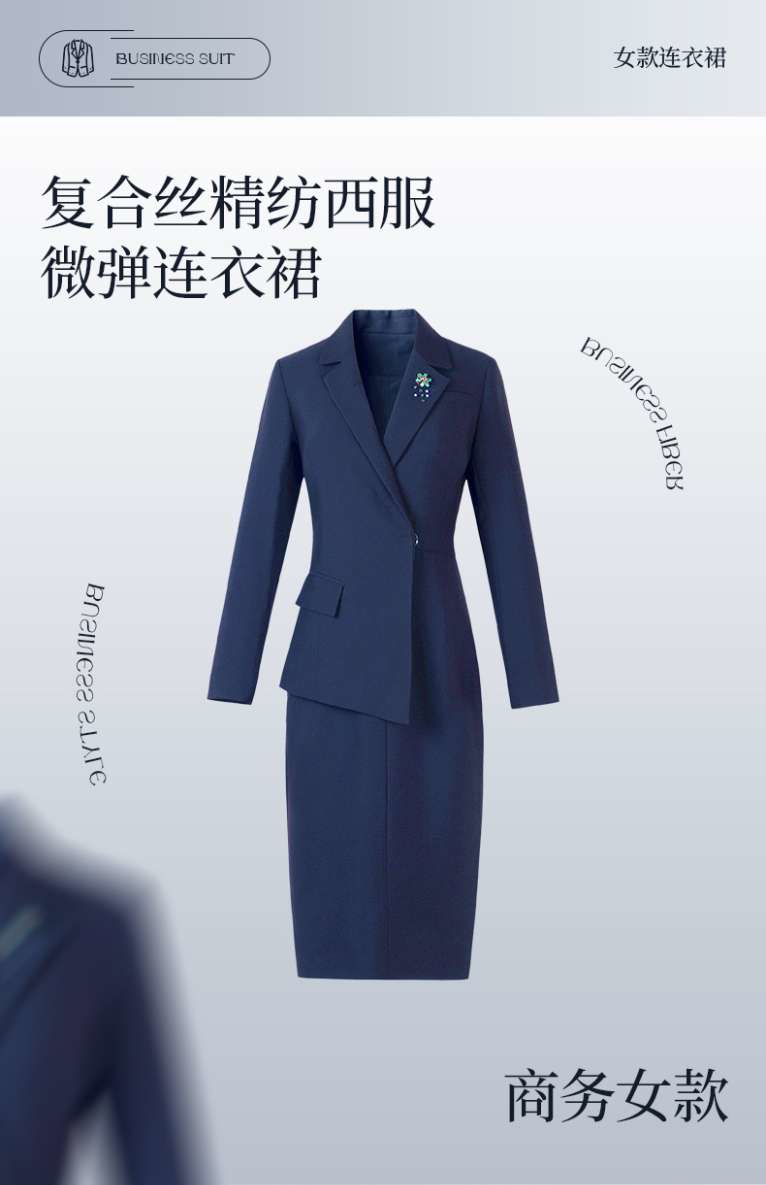 复合丝警方西服,微弹商务女款连衣裙;平驳领设计,突显职场女性的沉稳气质;修身的版型,款式简洁,整体彰显干练与魅力;品牌定制面料,挺括不易变形,穿着透气、舒适;