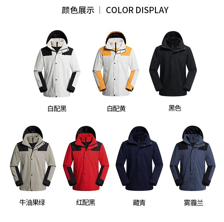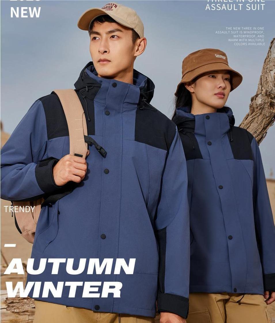 男女同款冲锋衣,款式新颖,面料形成斥水层,产生荷叶拒水效应,出行遇到雨天也能从容应对。